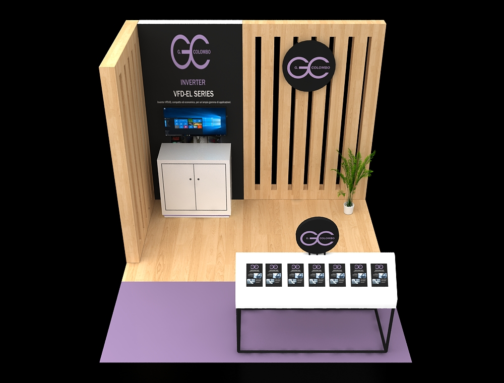 This 10x10 inline stand maximizes display space with a full graphic backdrop featuring a header. Digital monitors are mounted centrally above a long, wood-finished counter. This counter incorporates three concealed storage cabinets beneath. A prominent, illuminated reception counter sits near the front, all defined by dark wood-look flooring.