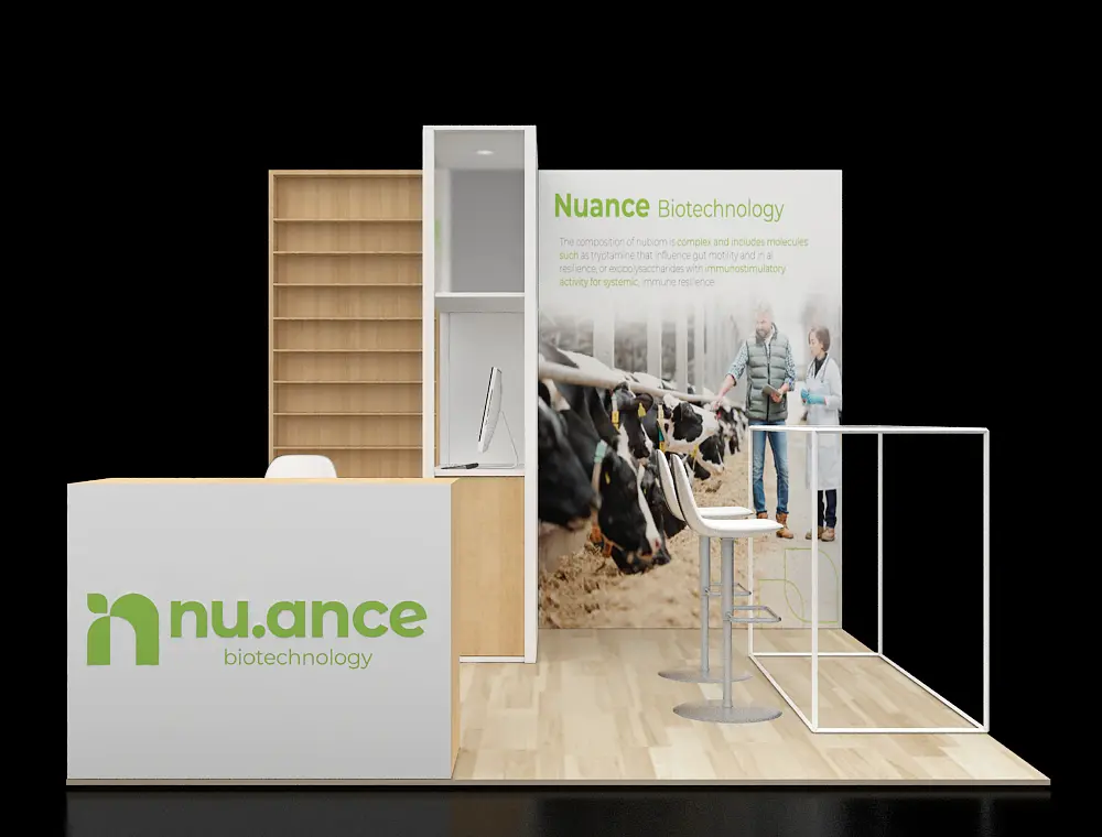 This 10x10 corner stand incorporates a tall, open-slat shelving unit next to a central cabinet. The cabinet features an integrated media display area and closed storage. A large graphic panel frames the presentation space, which is completed by a branded welcome counter, a high-top discussion table with two chairs, and light wood flooring.
