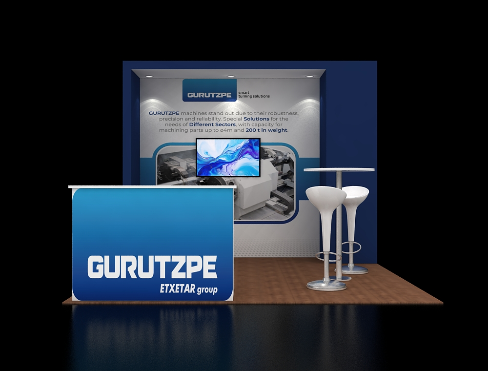 The 10x10 exhibit configuration features a primary reception counter and a back wall designed for media display. It includes a wall-mounted flat-screen monitor, a high round table, and two matching bar stools for standing meetings. The display rests on a dark wood-look floor.