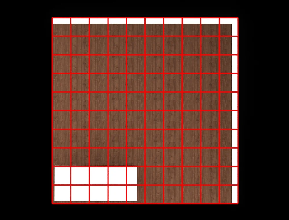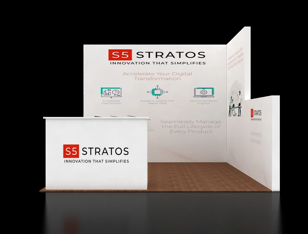 This 10x10 inline display features three solid graphic walls creating an enclosed space, complemented by a prominently branded reception counter positioned at the front. The floor area utilizes a simulated wood-grain covering, offering a clear and focused presentation zone.