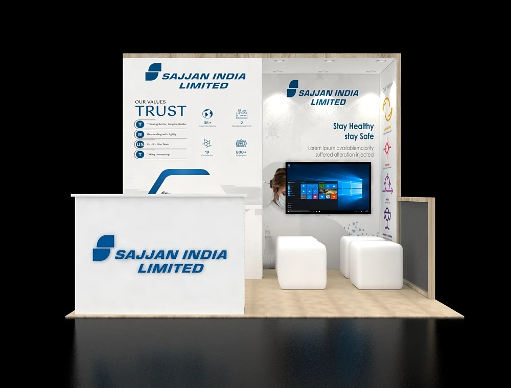 This 10x10 corner exhibit features wood-look architectural trim and a semi-private meeting area defined by a structural wall. It includes a large front reception counter, a wall-mounted digital display, and soft block seating for visitor consultations./p>
