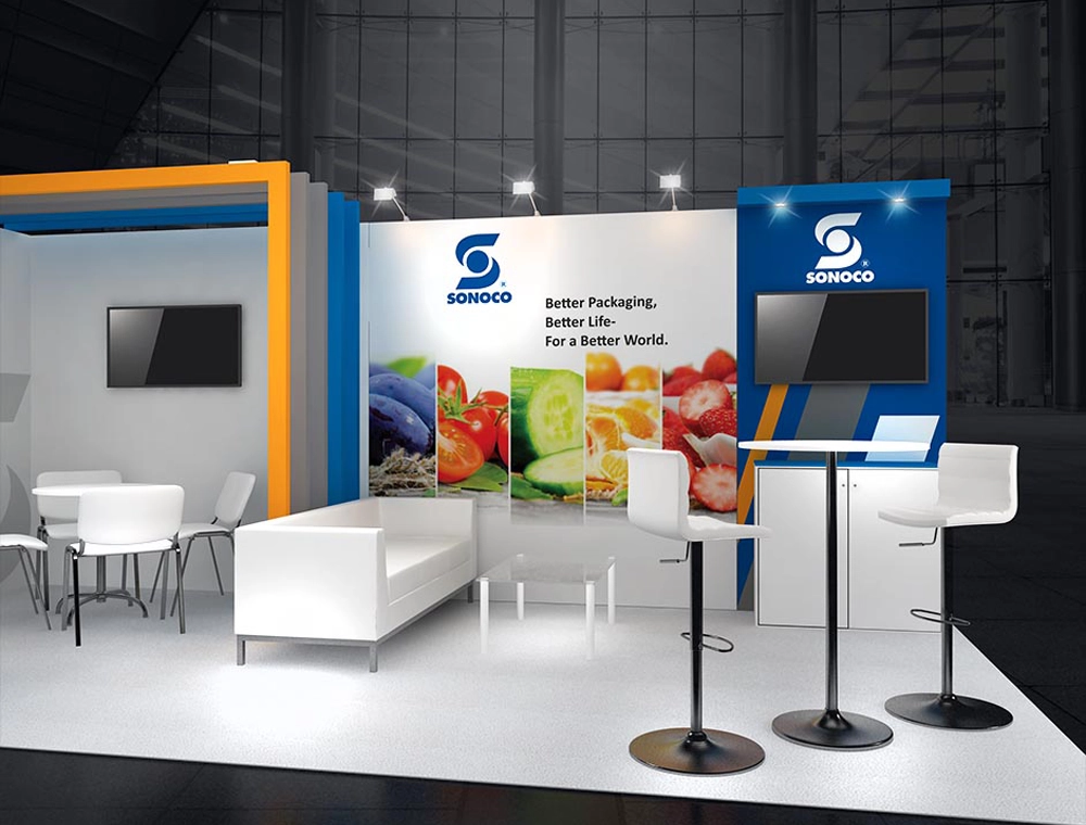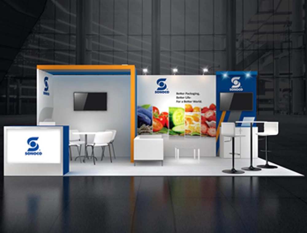 The 10x20 exhibit is divided into distinct zones, featuring a prominent media wall with integrated storage and dual digital displays. It offers various meeting options, including a low-profile lounge and high-top tables, accented by a bold overhead structural header.