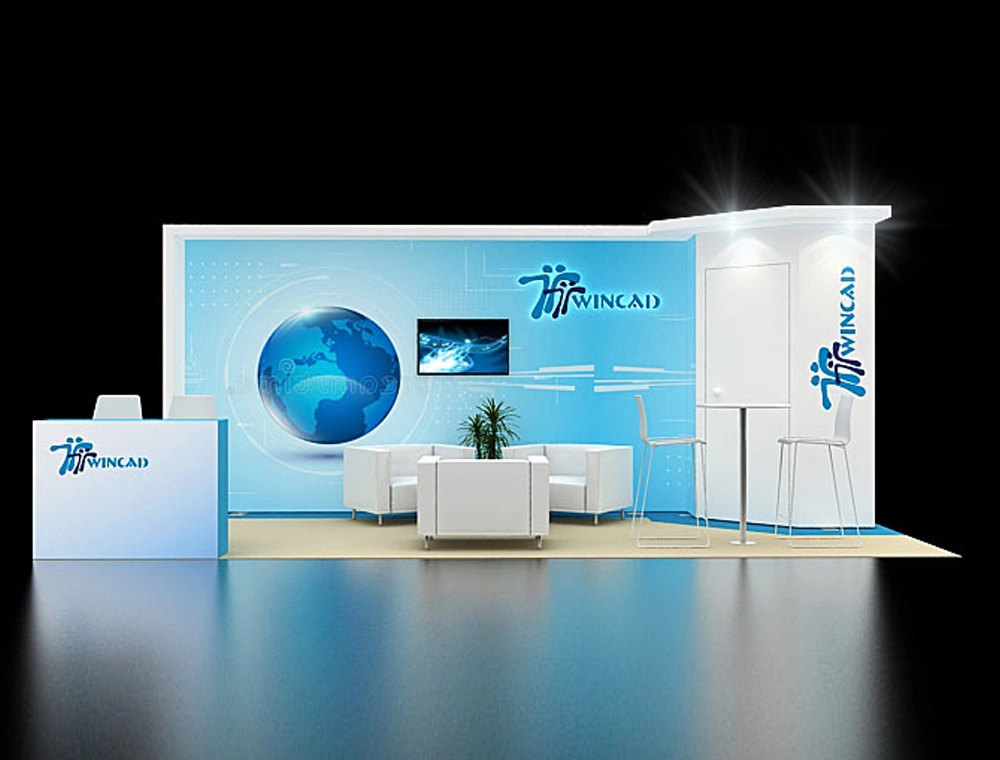 The 10x20 display features a large graphic backwall, integrated monitor, and distinct lounge area with armchairs and a glass table. A separate high-top meeting section and a prominent front reception counter complete the layout, providing varied engagement points within the two-tone carpeted space.