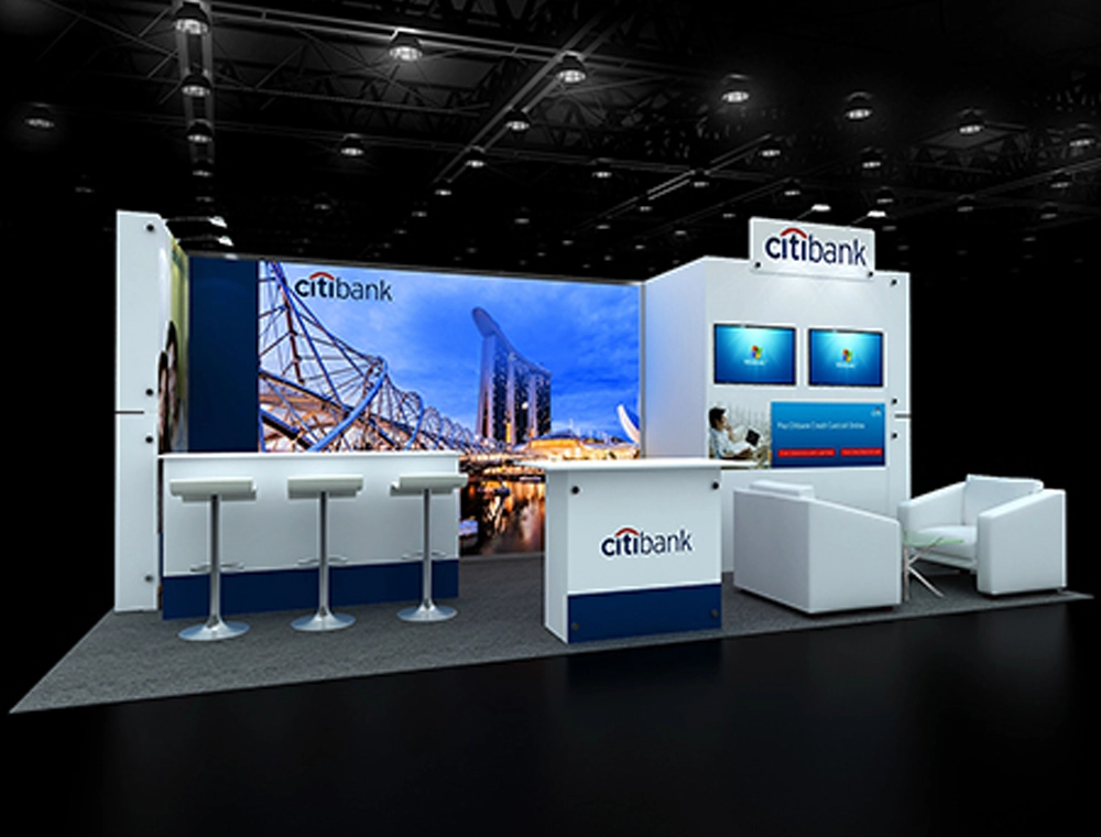The 10x20 display features an expansive, dominant graphic wall contrasted with a structured white media panel containing twin monitors. The layout defines two seating areas: a high-top counter with bar stools and a private lounge area with two chairs and a glass table, separated by a central reception desk.