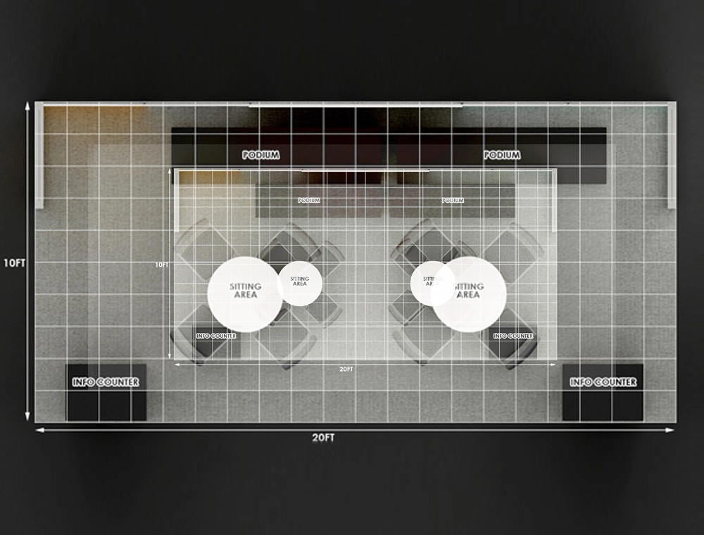 This 10x20 structure features a multi-section backwall with high-contrast graphic panels and two counter-height demonstration desks. The layout incorporates two separate round tables with chairs for meetings and dual rectangular branding podiums near the corners, all contained within the carpeted floor area.