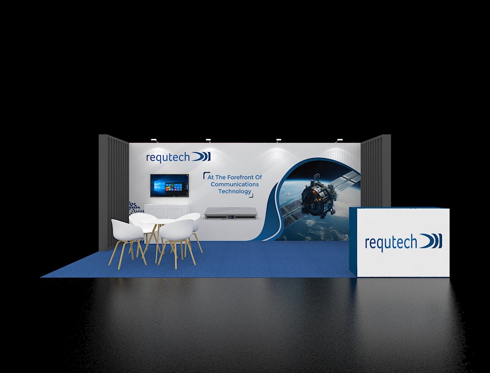 This 10x20 trade show booth features a deep blue carpet contrasting with white graphics. It includes a circular table and four white chairs for meetings, alongside a dedicated media station with a monitor and storage cabinet. The design is framed by angled, textured side walls and anchored by a branded front reception counter.