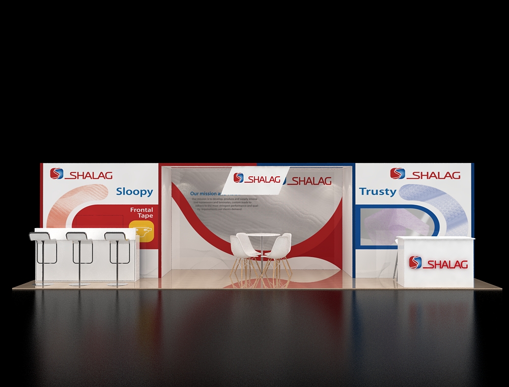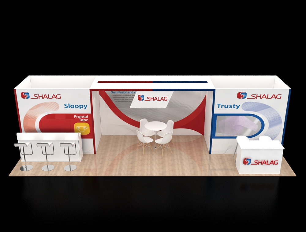 This 10x30 exhibit is characterized by two flanking white walls, each holding a mounted screen. A central dark niche defines the middle section. The layout includes both a casual low-seating area and a high counter with two stools. A wood-look floor platform anchors the design.