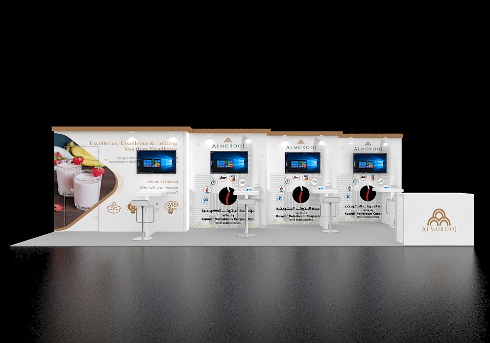 This 10x30 custom exhibit features a striking red and white graphic backwall. The layout includes a four-person casual lounge area, a high bar counter with stools, and a central pillar integrating a small monitor and counter. The entire display rests on elevated white flooring.