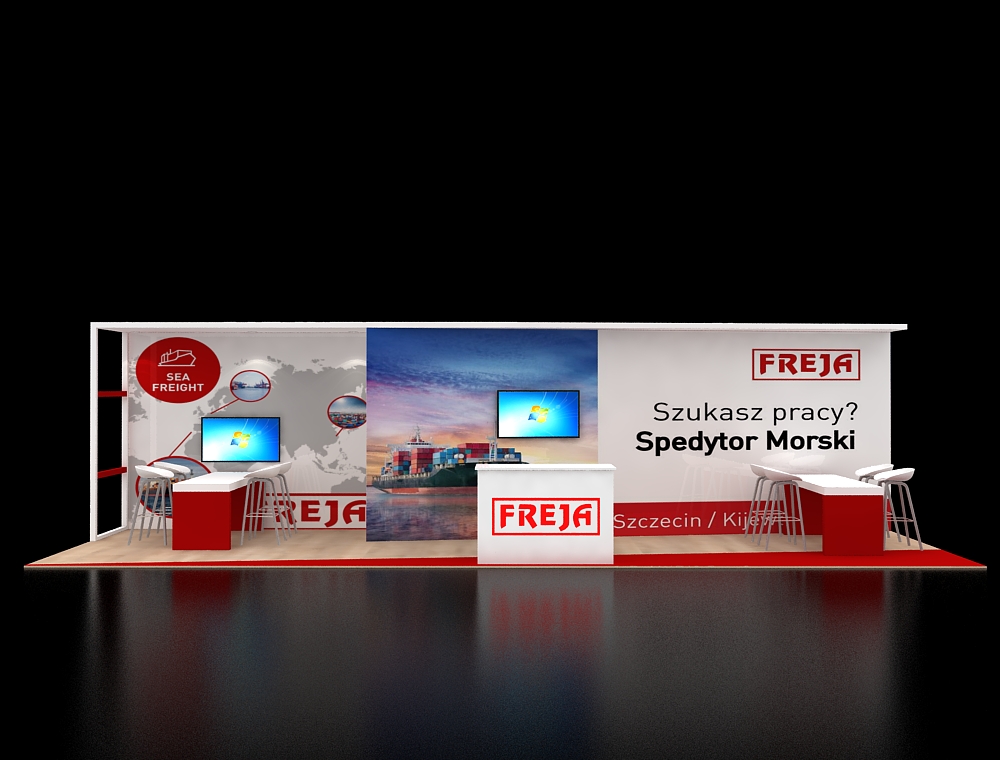 This 10x30 exhibit features a long graphic backwall divided into three distinct panels. The structure incorporates two high-resolution monitors and two high-top demo tables with stools. A central reception counter provides a main point of contact. The floor features red accent carpet over wood-look laminate.