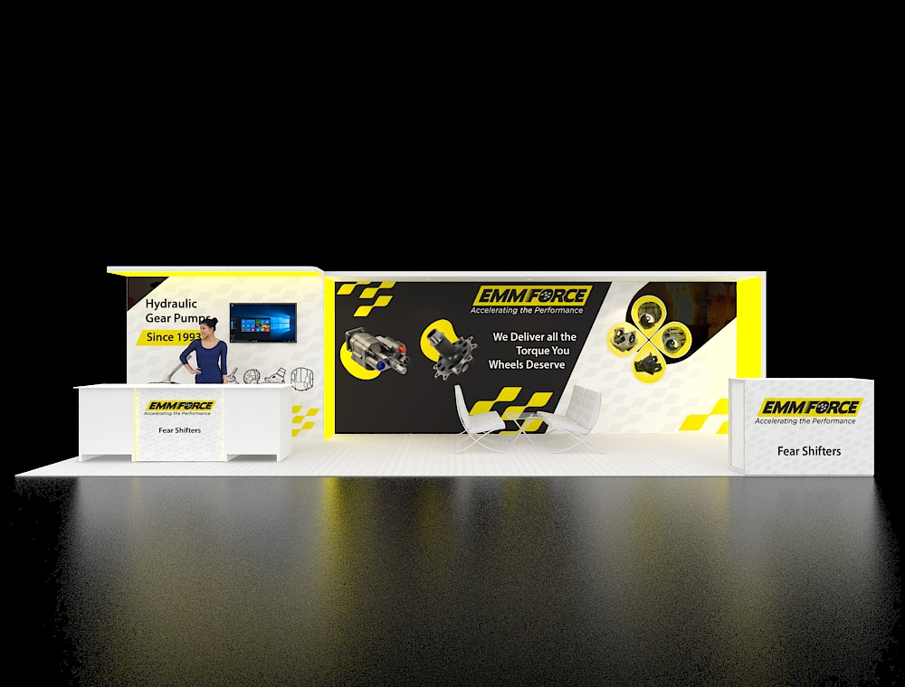 This 10x30 exhibit features a dynamic design with prominent graphic walls and a bright yellow canopy. It includes a large central reception counter, a wall-mounted display monitor, and a separate, modern visitor lounge area with low seating. A small accessory pedestal is located near the entrance.