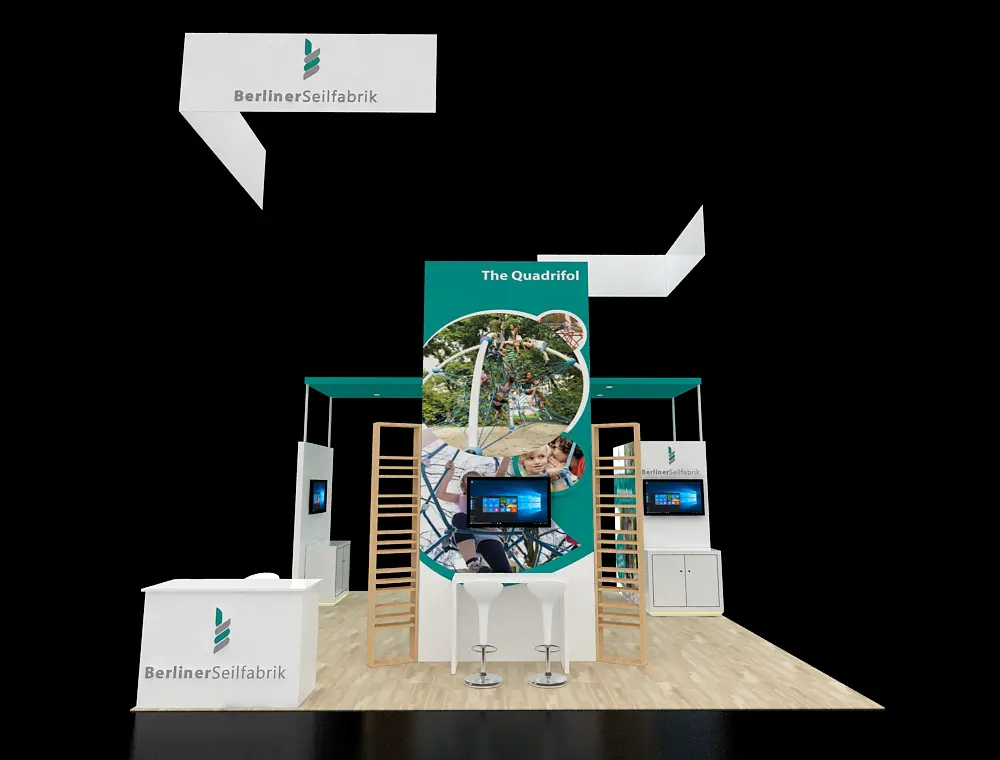 This 20x20 exhibit features a tall central graphic tower flanked by two identical side kiosks with monitors. It incorporates light wood shelving for display, a reception counter, and bar-height seating, all within a clean, open floor plan defined by a perimeter arch structure and wood-effect flooring.