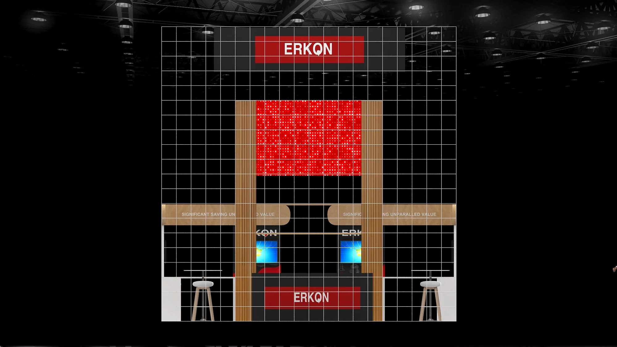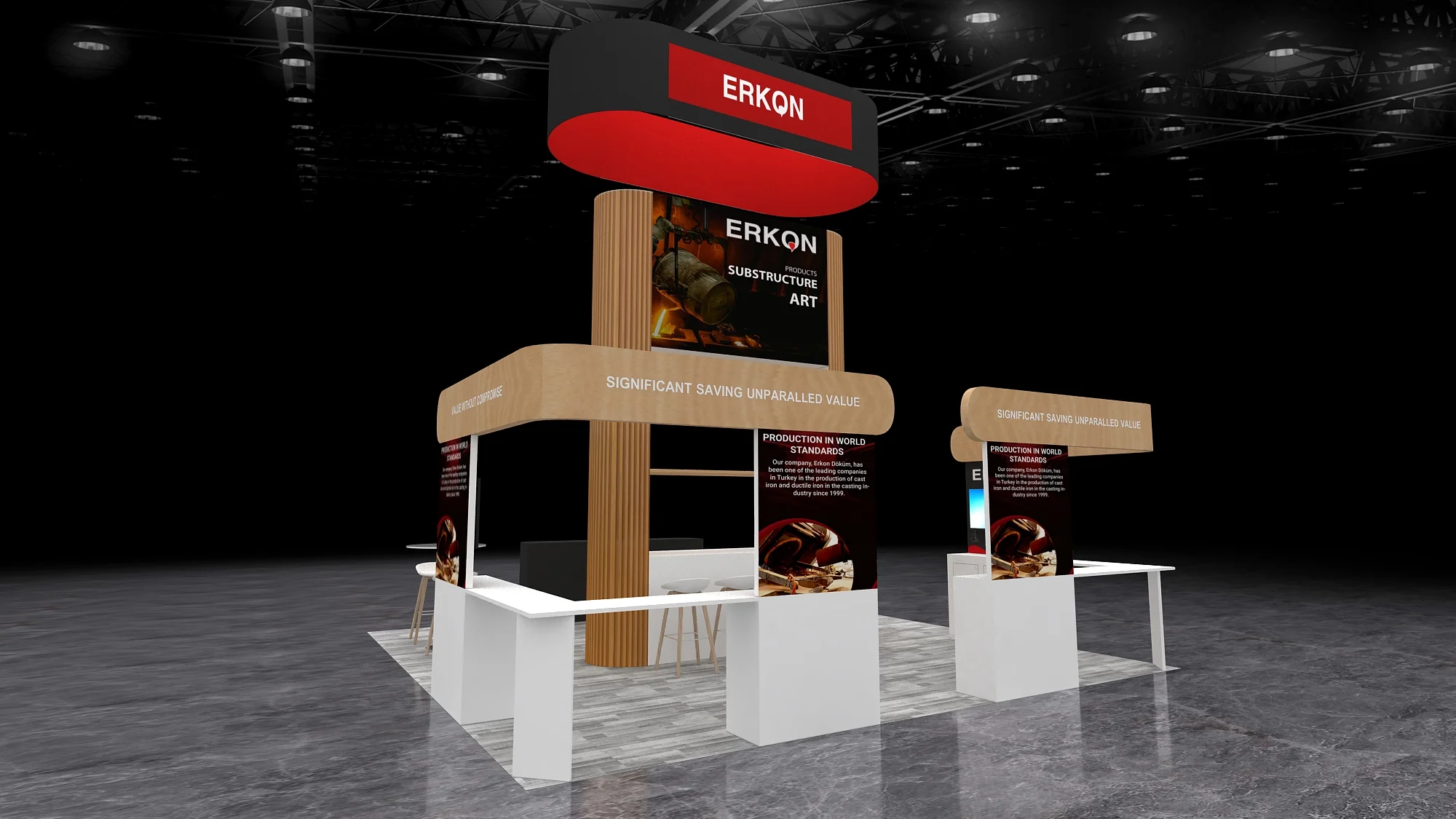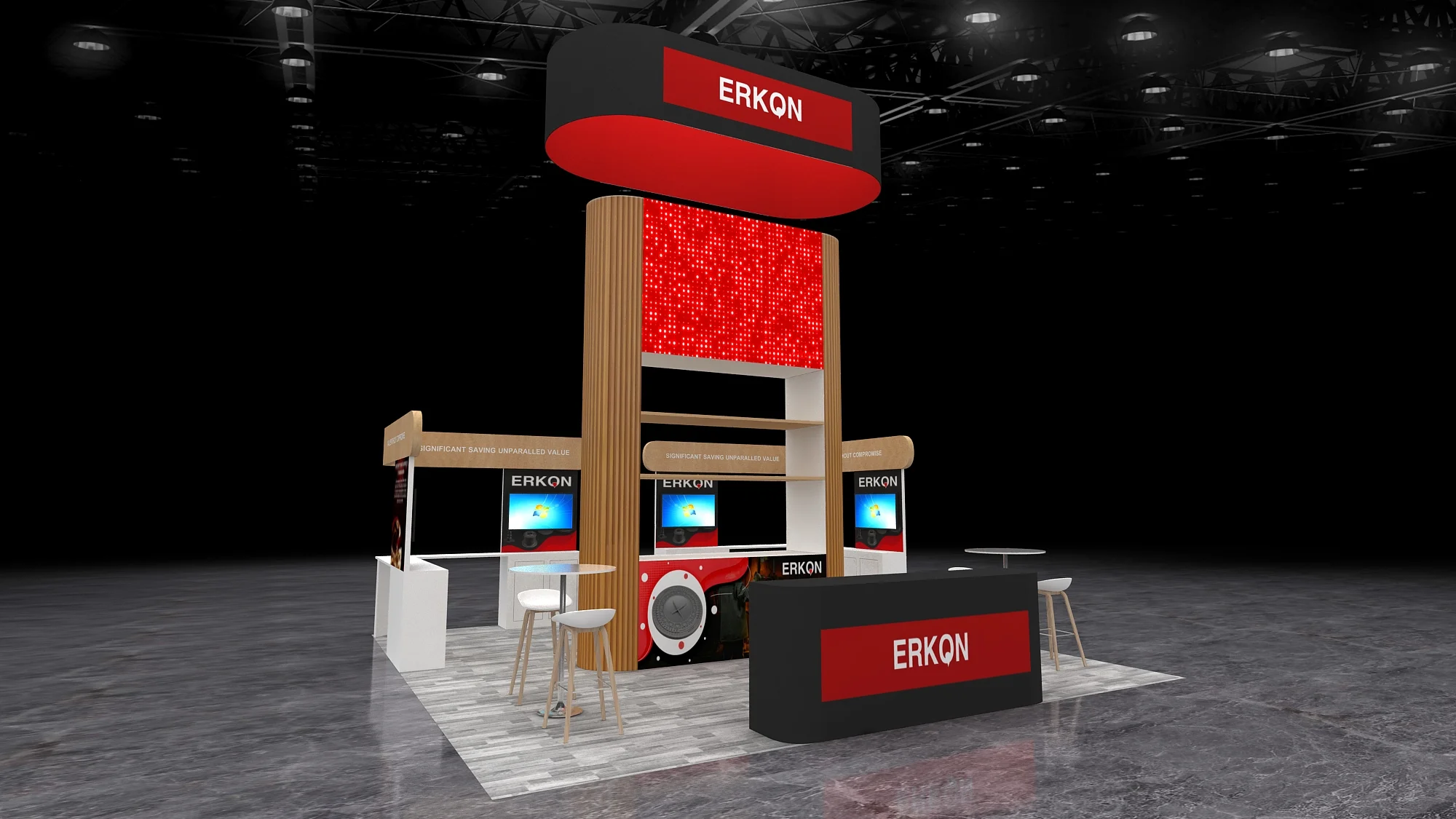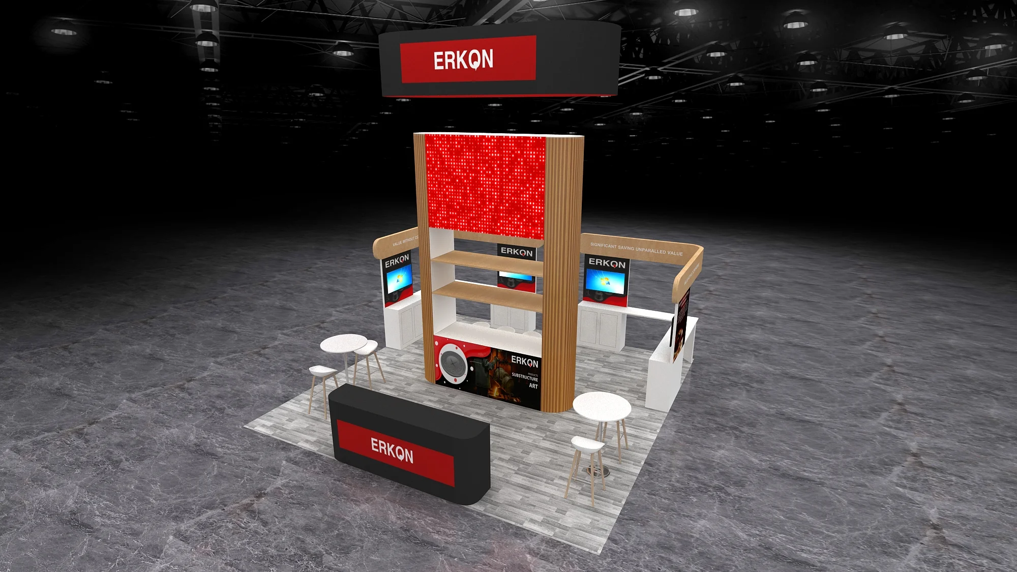 This 20x20 inline display features a central square column with an integrated media screen. Two curved overhead arches extend from the center, creating dual seating zones with small round tables and high-top stools. A low reception counter stands in the foreground, complementing the circular graphic accents and open layout.