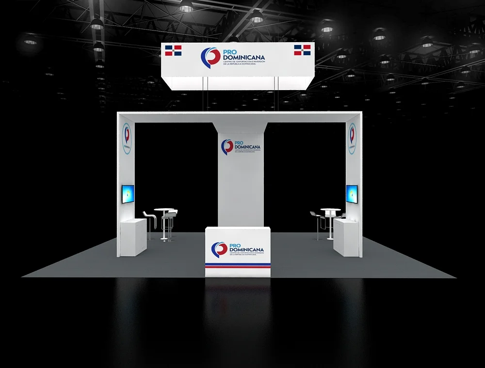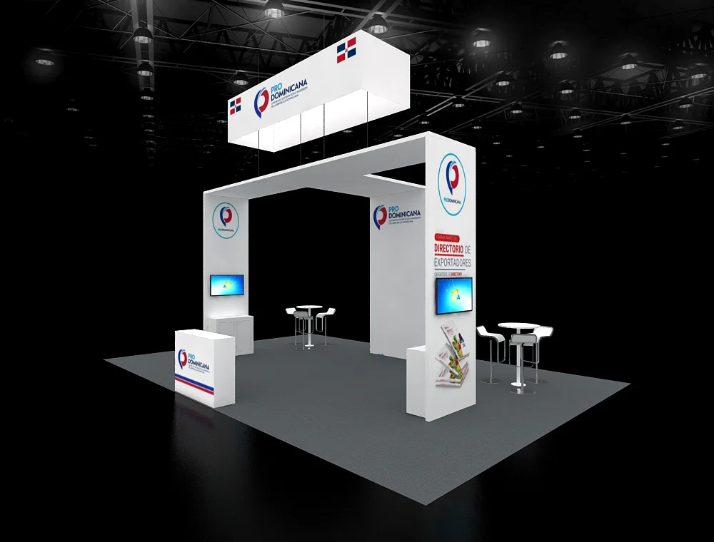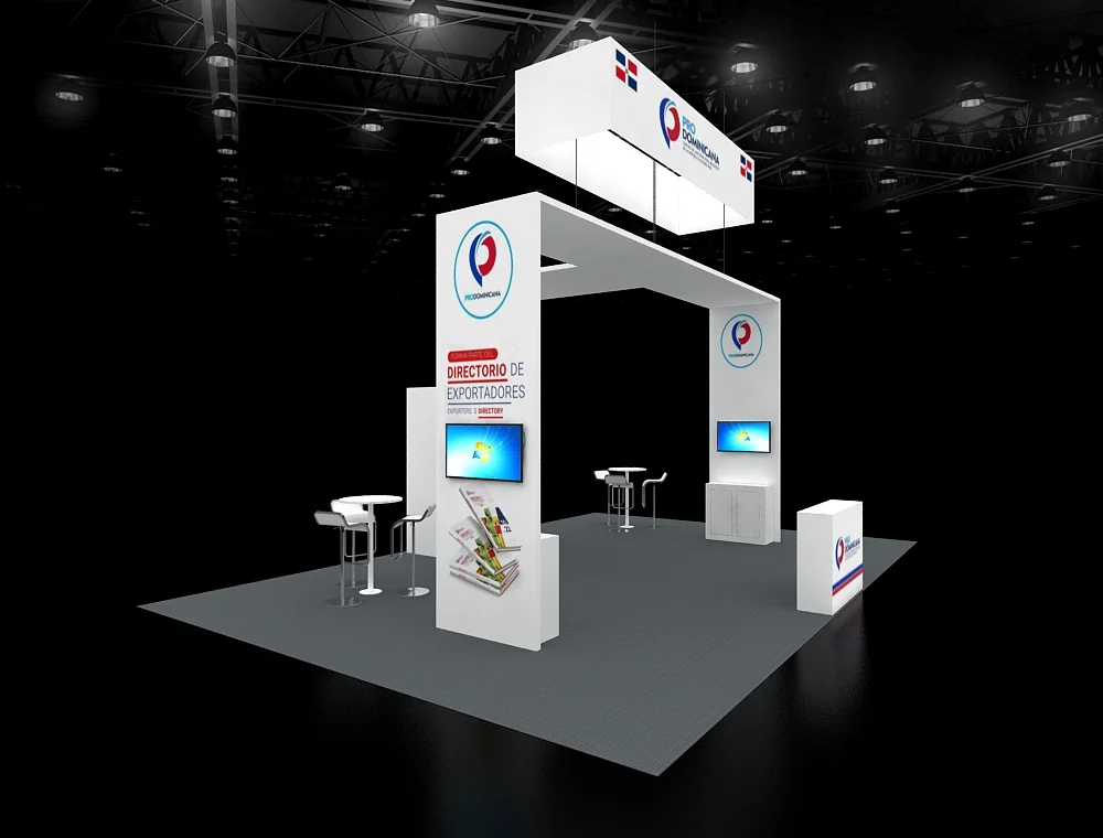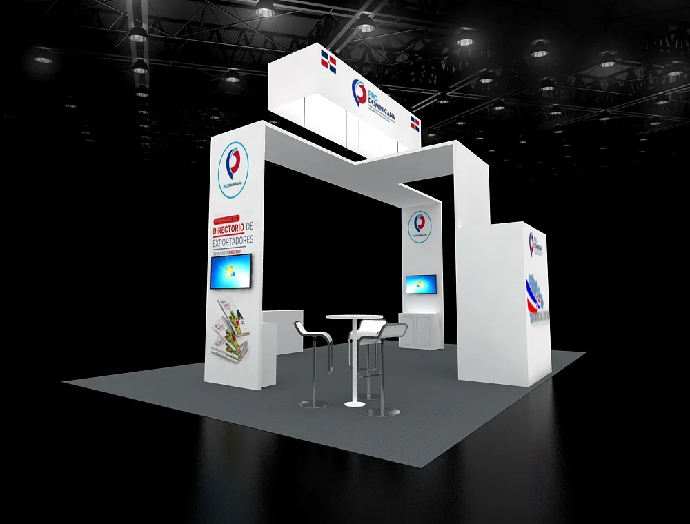 This 20x30 exhibition stand features a prominent dark, suspended cube sign and a central angled pylon structure with a wood-slat finish. The design incorporates multiple digital screens, high-top gathering tables, and a visually striking corner lounge area defined by bold, blue soft seating, all resting on light wood-effect flooring.