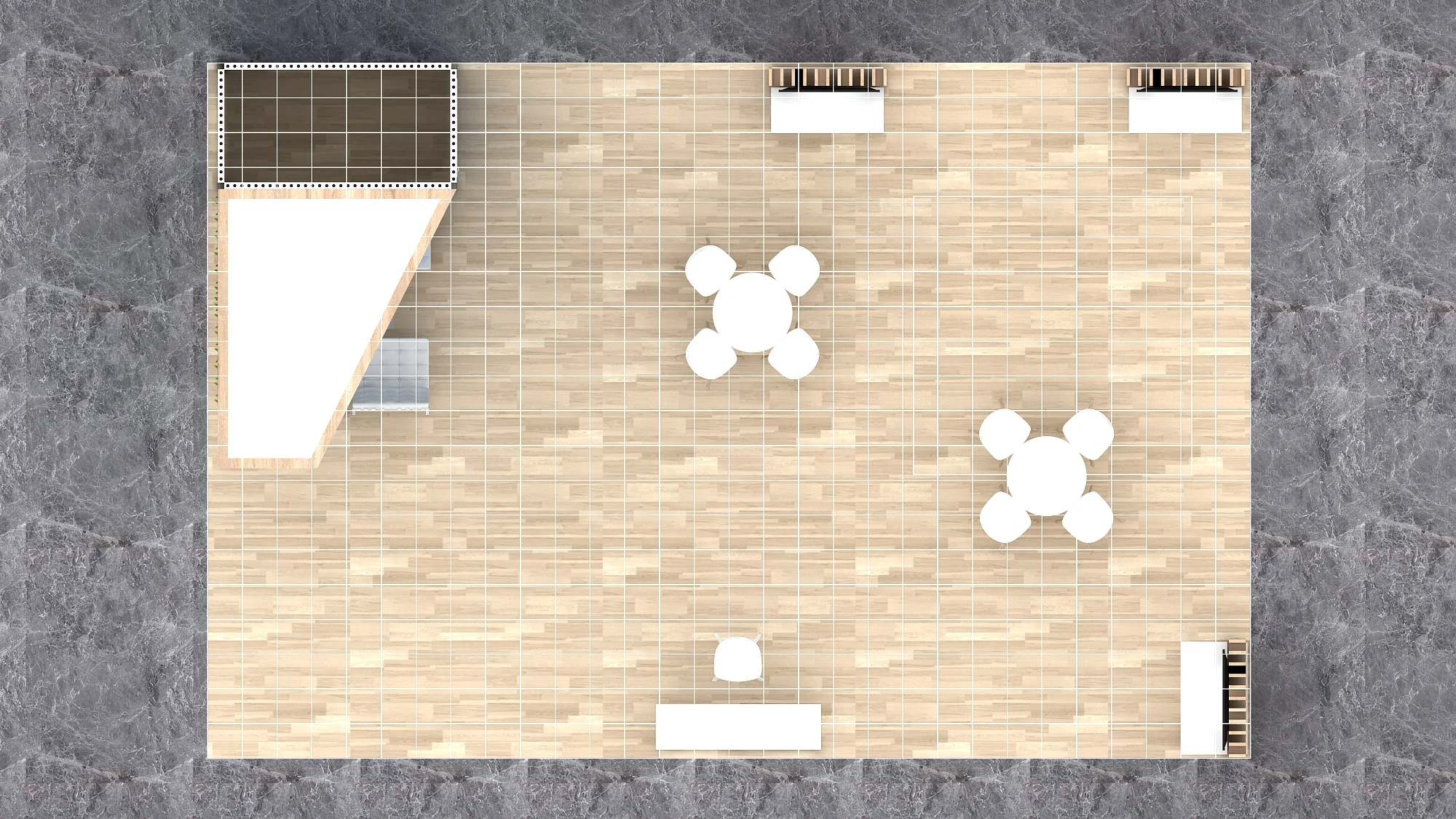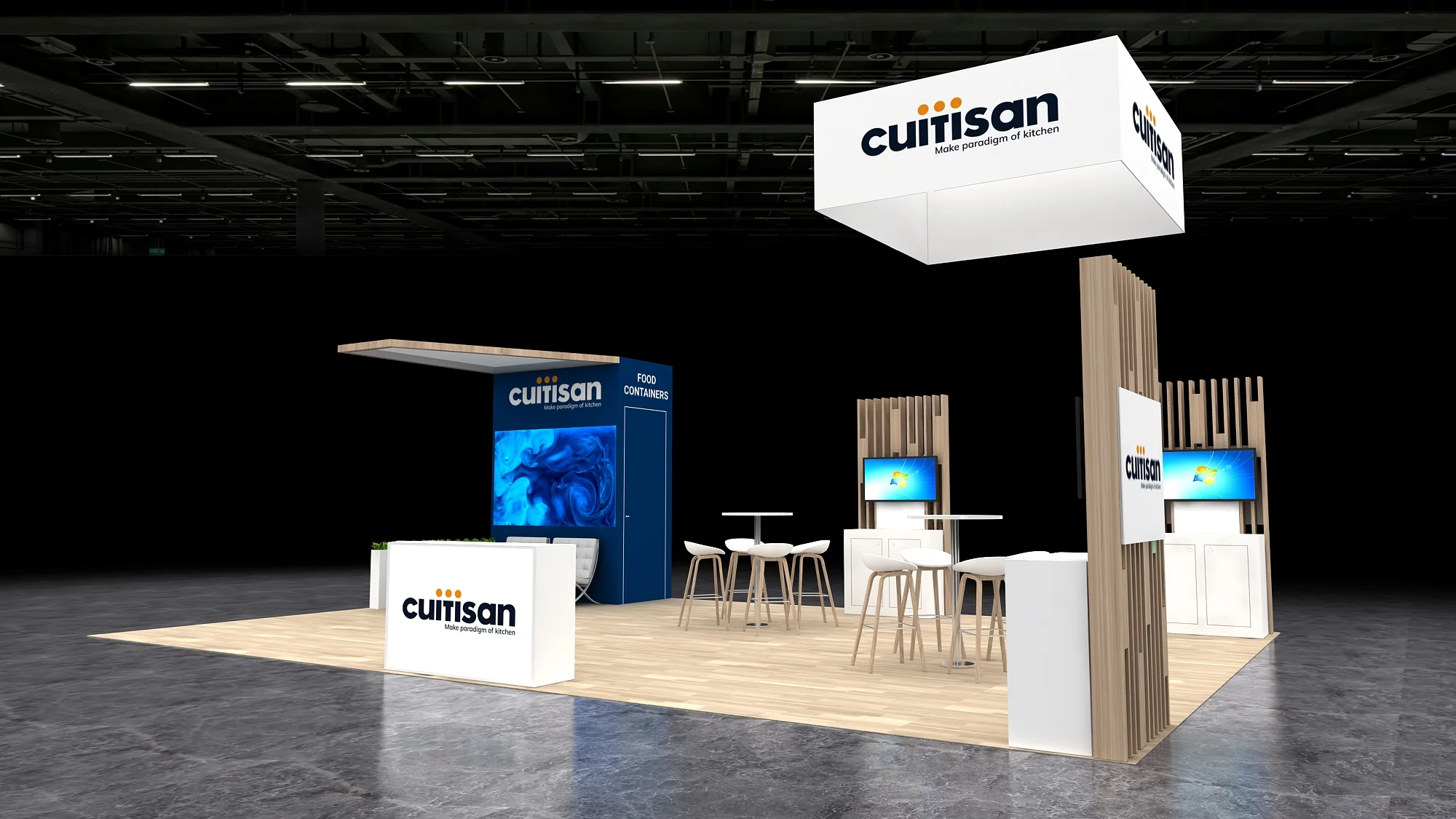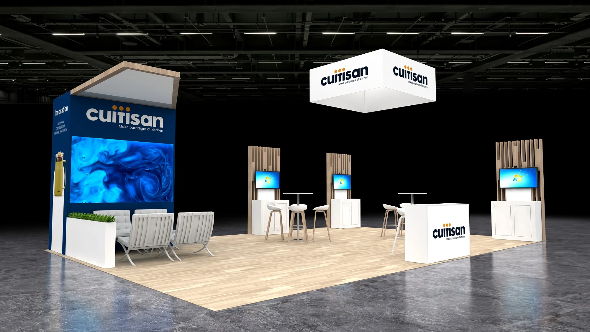 This 20x30 exhibit features a large, suspended cube sign and a central, angled structure with wood accents and a vertical graphic. The open floor plan includes twin demo stations with screens, high-top collaboration tables, and a vibrant blue lounge area, all resting on a light wood-effect floor covering.