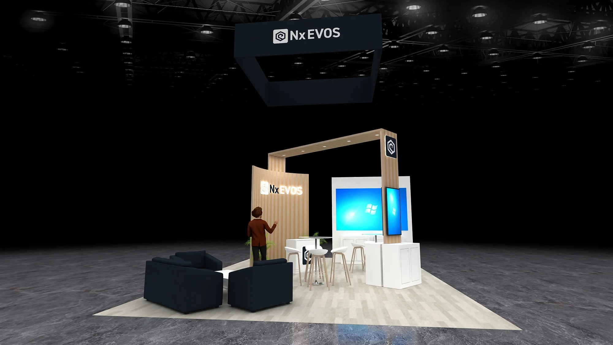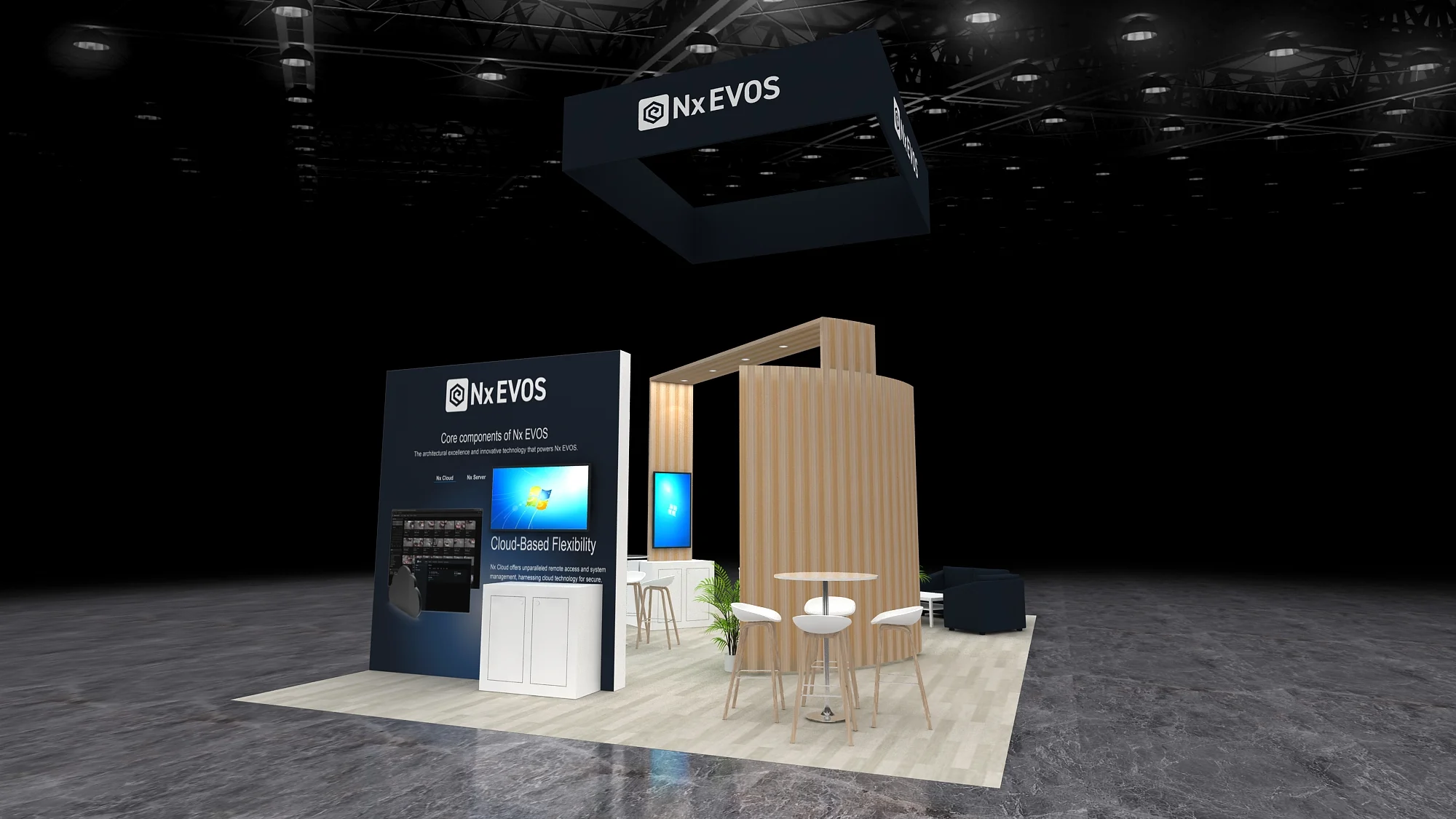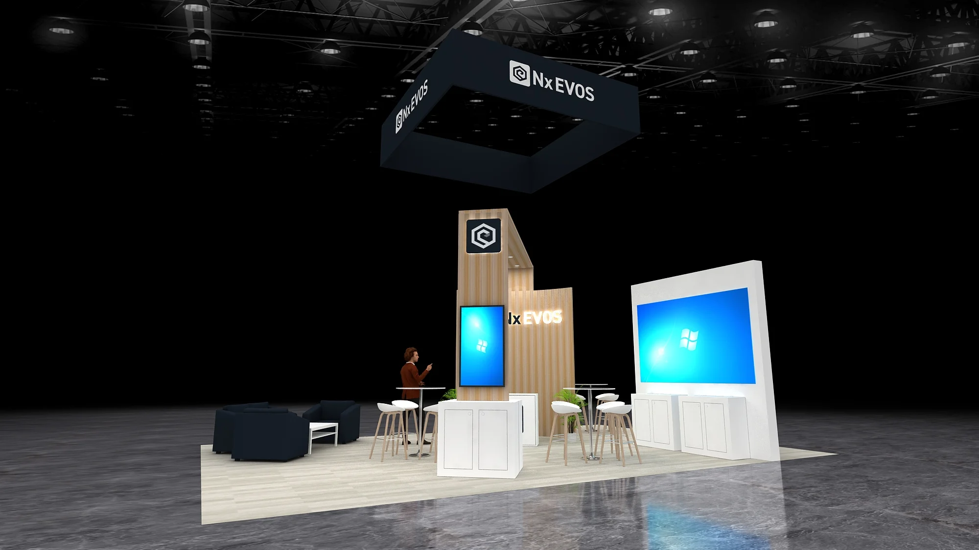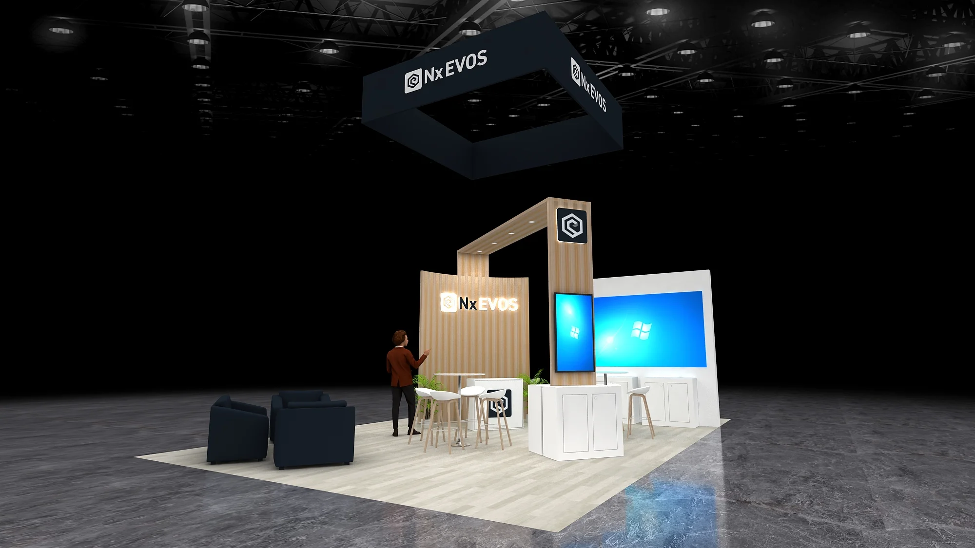 This 20x30 exhibit features prominent dual digital displays for demonstrations and a central branding pylon with integrated monitor. The design incorporates a relaxed lounge area with soft seating, high-top tables with stools, and a distinctive overhead cube structure, all set on a light wood-effect floor.