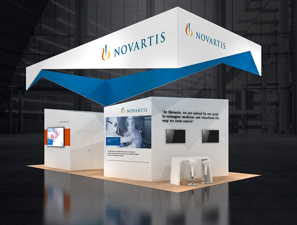 This 20x30 display is characterized by a dramatic, blue-accented angled overhead canopy. The floor space is divided by two main graphic cubes. It features multiple integrated screens for media content, a high-top counter, and two small display pedestals, all set on light-colored flooring.