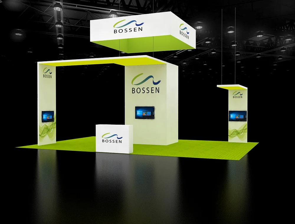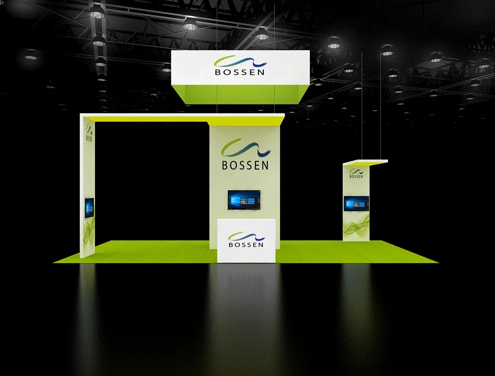 This 20x30 exhibit utilizes a high-impact L-shaped overhead sign for visibility. It features two tall multimedia kiosks with integrated screens and two distinct lounge areas for visitor engagement. A structured tower with additional graphics and a low reception counter defines the functional zones.