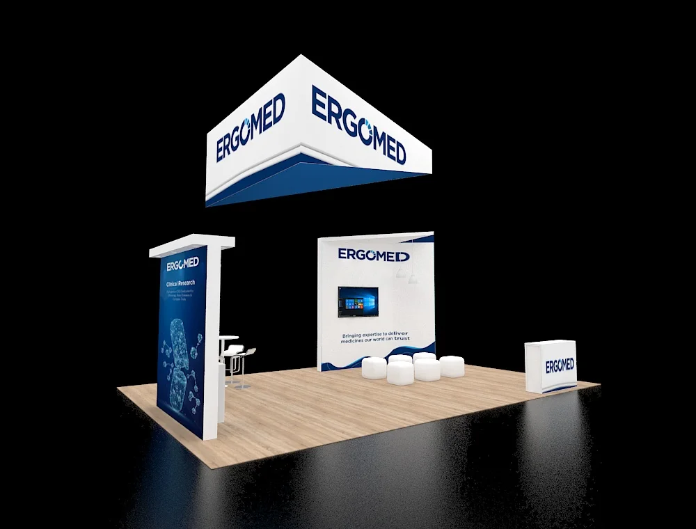 This 20x30 exhibit utilizes a mix of white structure and natural wood paneling. A large overhead sign ensures high visibility. The space includes an intimate visitor seating nook with two chairs and a screen display. Decorative shelving and a lower reception counter are integrated into the design.