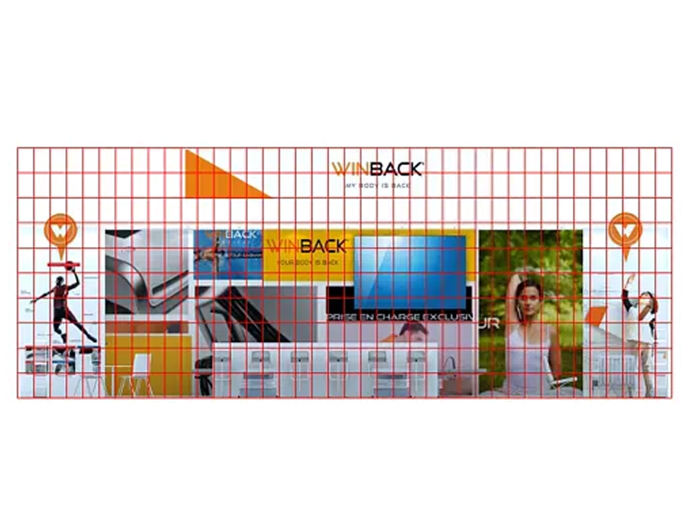 This 20x40 island exhibit is characterized by its cube-shaped overhead signage and striking blue and white color scheme. It integrates a structural archway, two separate information towers, and a central discussion counter with high-top seating. The stand offers multiple consultation points and prominent graphic displays throughout the space.