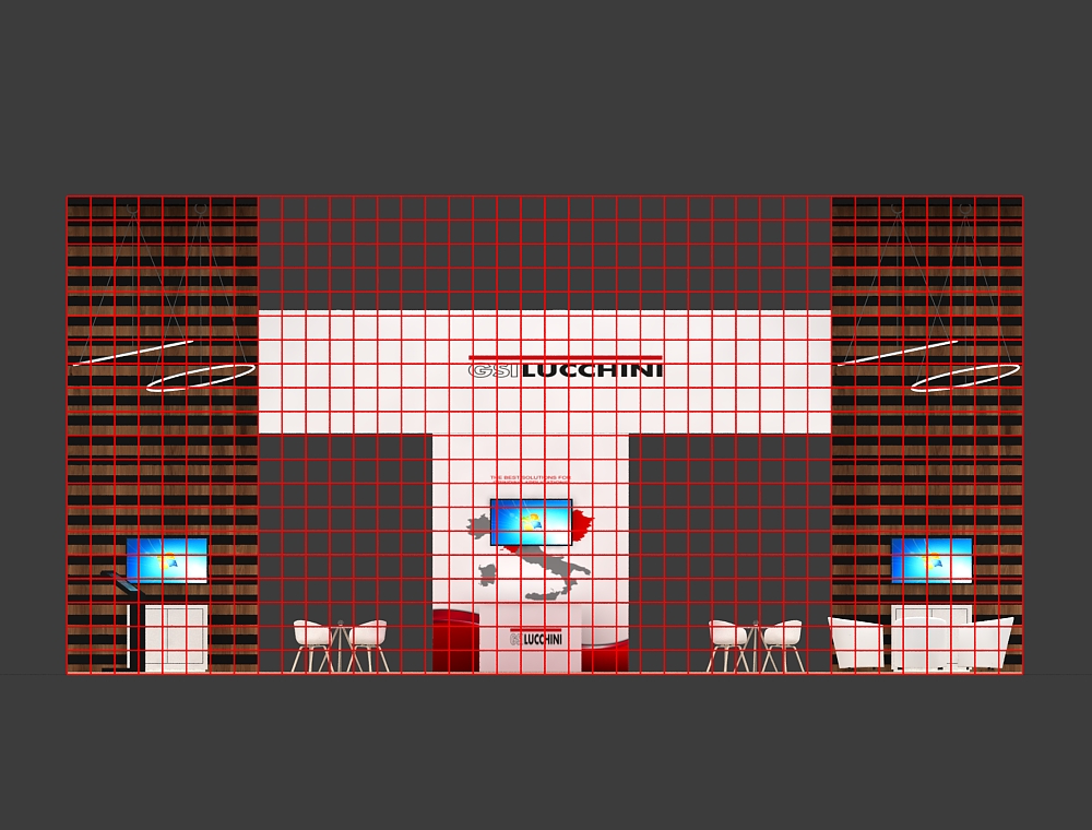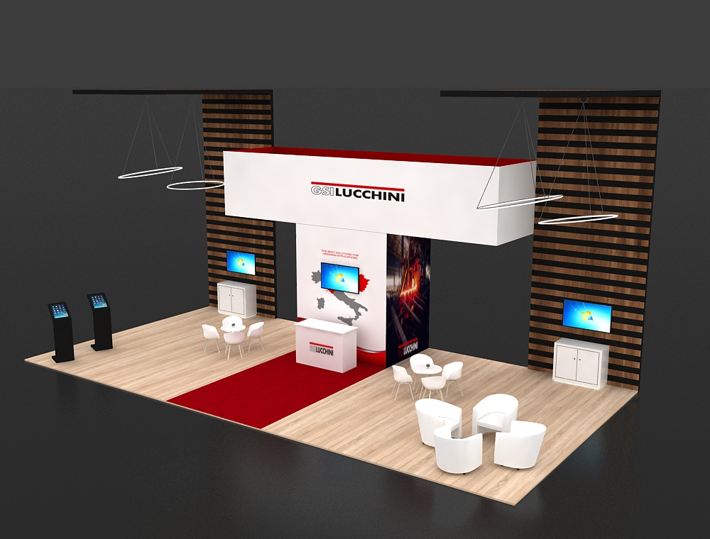This 20x40 island exhibit features an open arch structure supported by two tall graphic towers. Four monitors are integrated into the design: two on the central back wall and one on each tower's reception counter. A large rectangular overhead sign and multiple white chairs and tables for seating are included. The flooring is a light wood-look finish. There are a total of four monitors in this display.