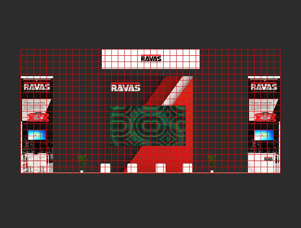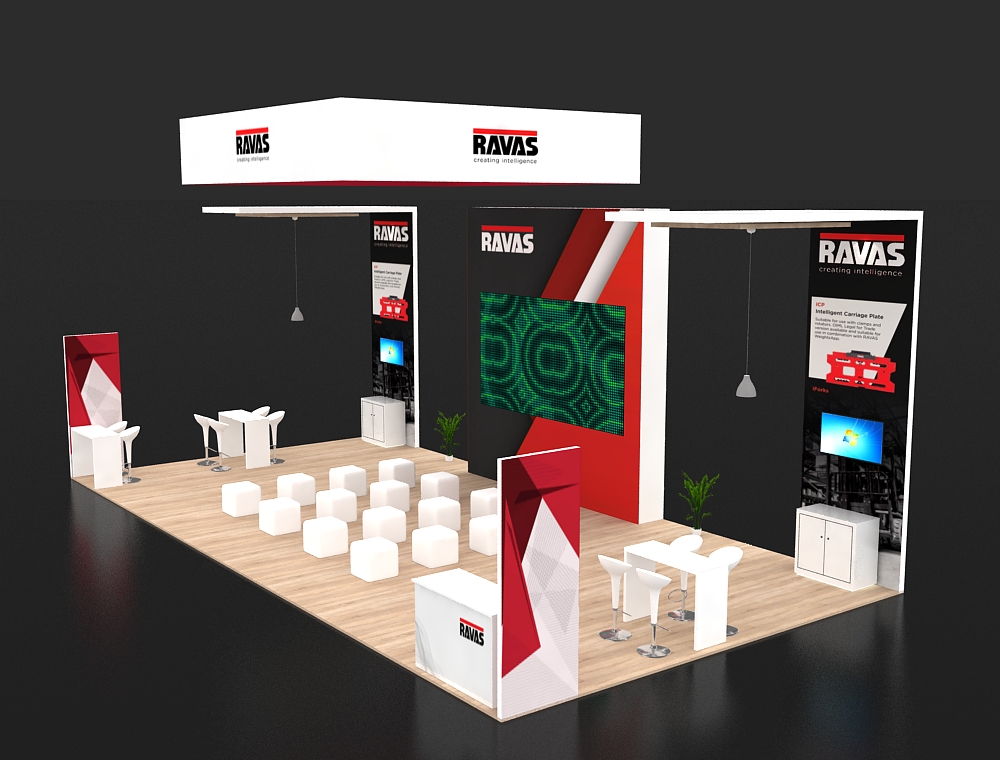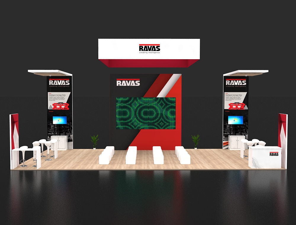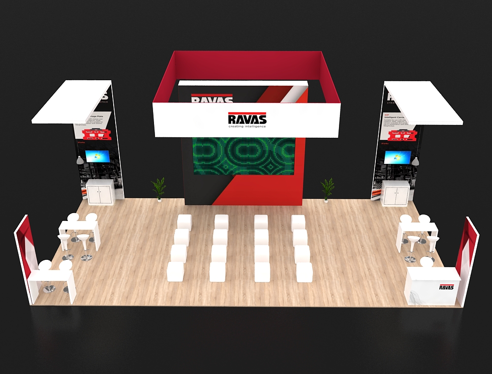 This 20x40 exhibition stand is defined by its strong red and white color scheme and modular towers. A central column displays one monitor, flanked by two side display walls, each featuring two monitors. The stand includes a front reception counter, two curved graphic panels, and two separate informal seating areas. There are a total of five monitors in this display.