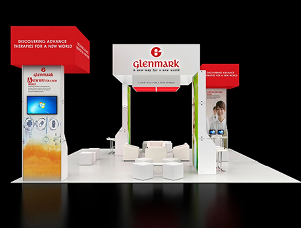 This 30x30 floor plan is anchored by a large white overhead canopy featuring blue interior accents. Two tall primary pillars house digital displays and integrated shelving for high-impact visual engagement. The layout includes a central lounge with white modular seating, complemented by side meeting areas with high tables and stools to facilitate professional networking.