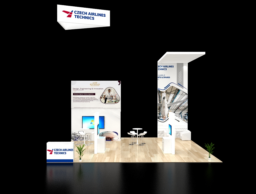 This exhibit features a prominent rectangular overhead sign and two dedicated interactive kiosks with integrated video displays. The design incorporates dark wood-look accent walls and two separate circular seating areas with white tables and chairs. A small reception counter greets visitors, all within an open layout on a light wood floor.