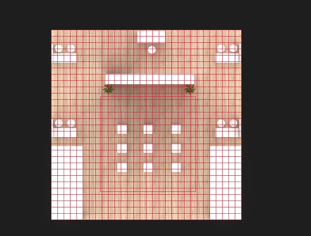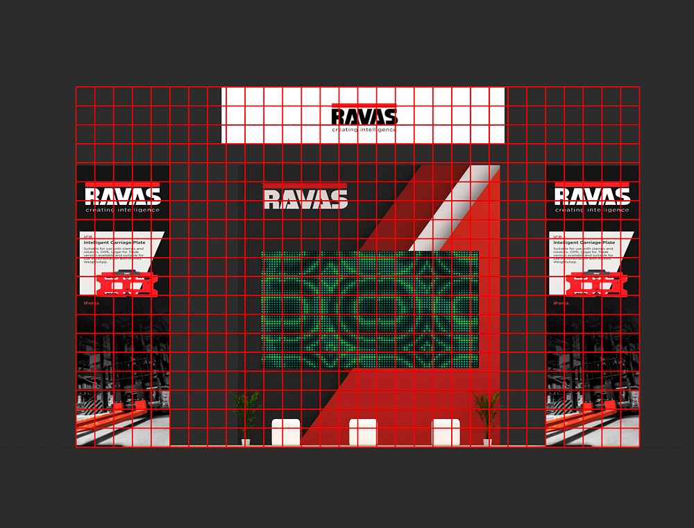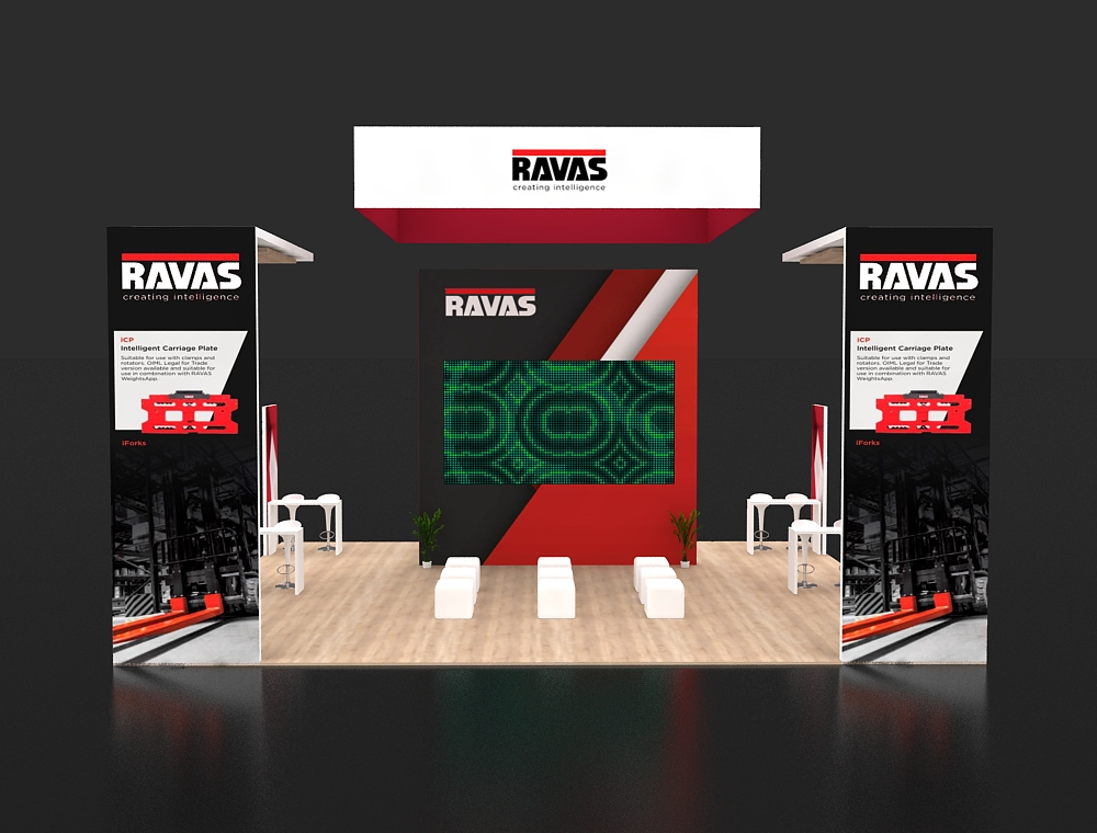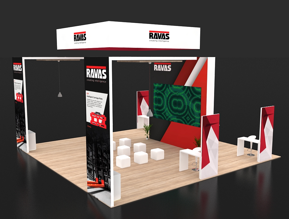 The booth design highlights a massive central video wall framed by red and black accent walls. The layout incorporates two tall graphic-clad display towers and a row of cushioned cubes for a presentation area. High-top standing tables are positioned near the towers, while a large overhead header defines the space, all resting on a wood-look floor.