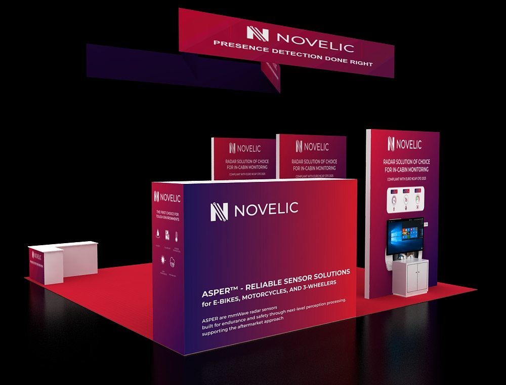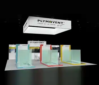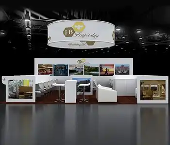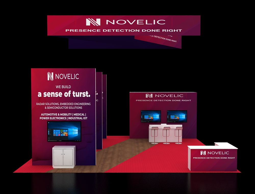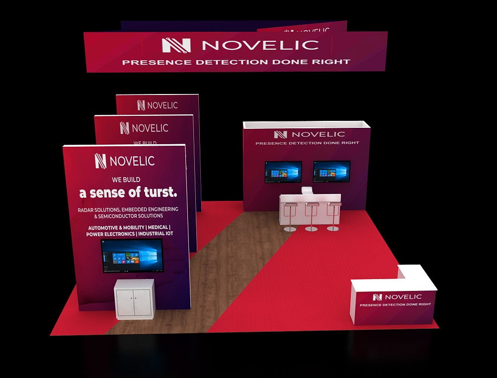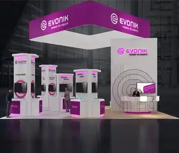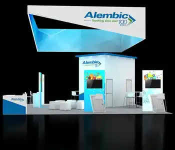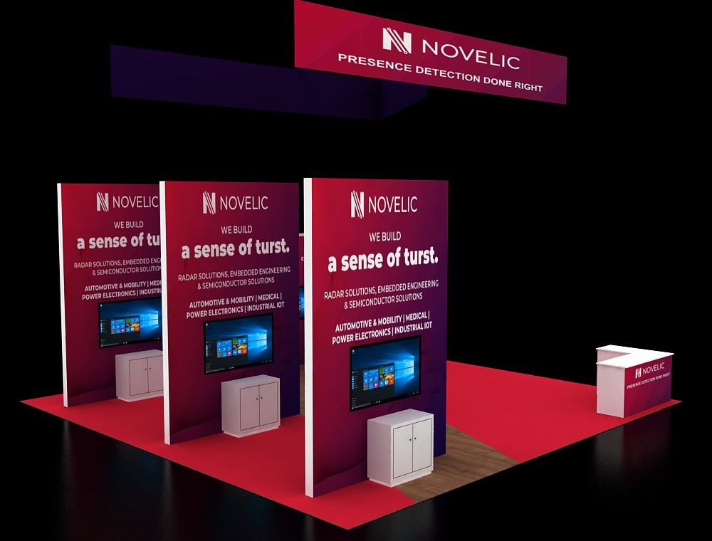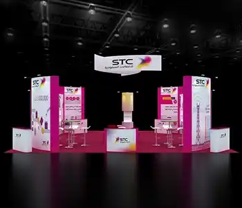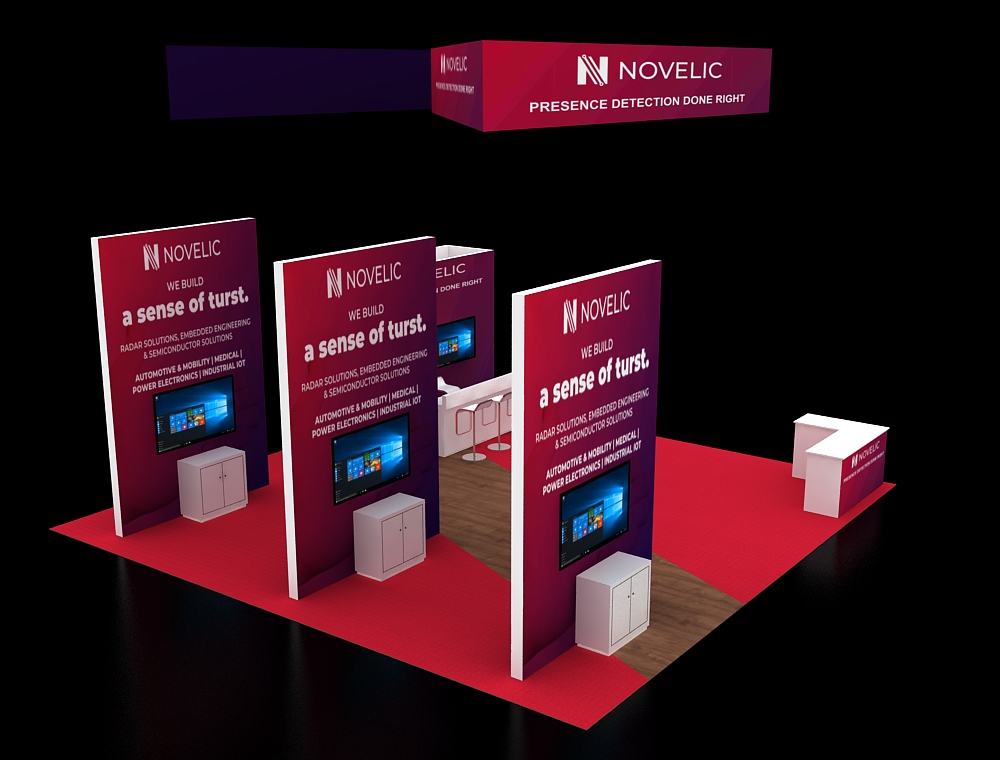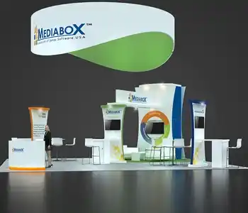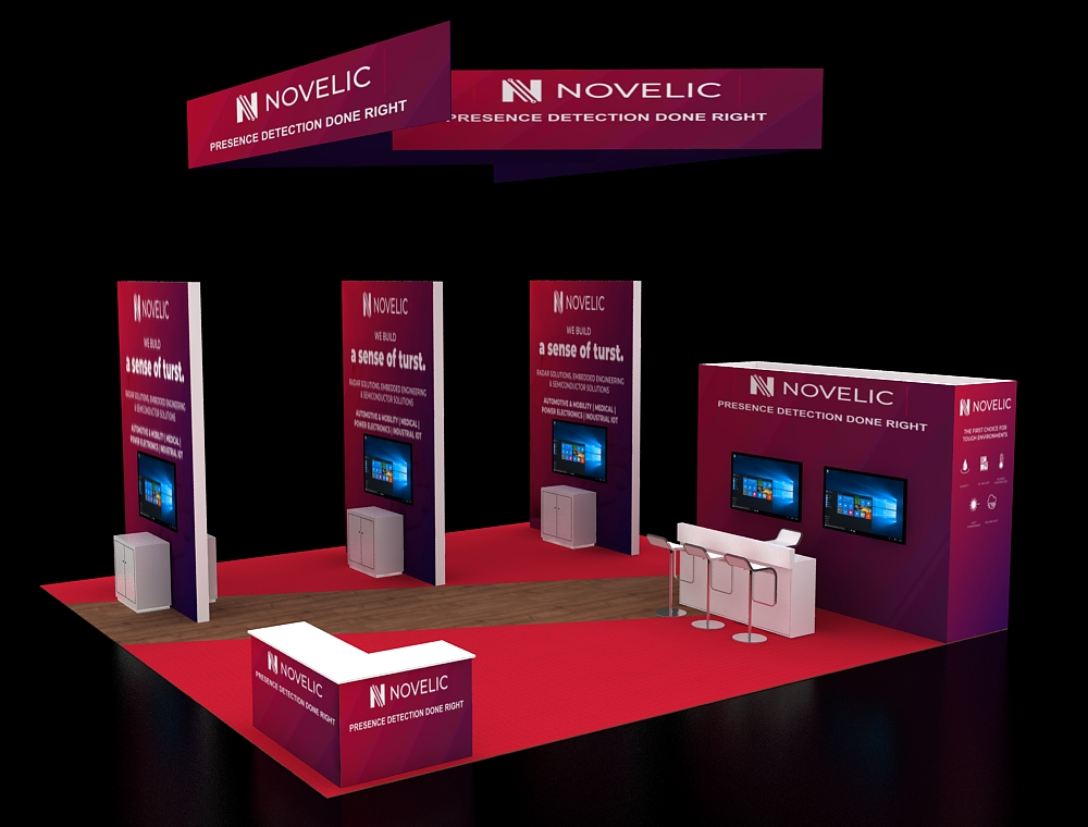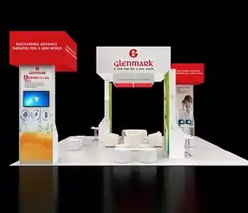 This 30x30 island exhibit utilizes a gray carpeted floor, prominent overhead signage (blue and orange), and a central structural tower. The layout includes perimeter glass display showcases, a low central seating area, and multiple media points for detailed product demonstrations and customer consultation.
