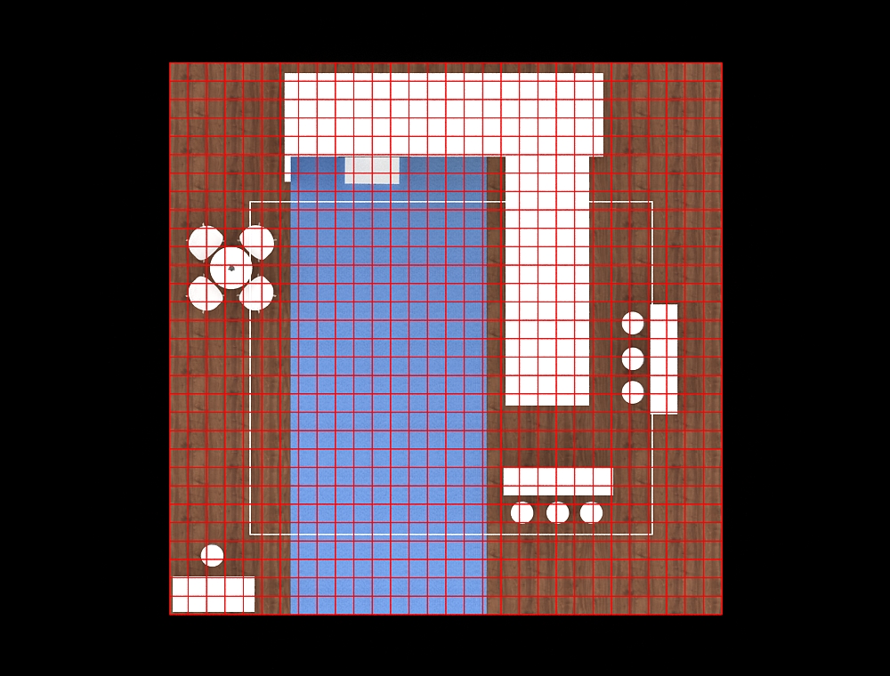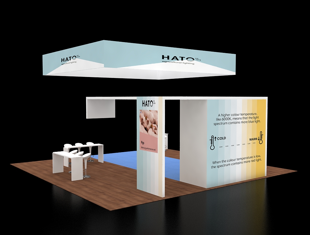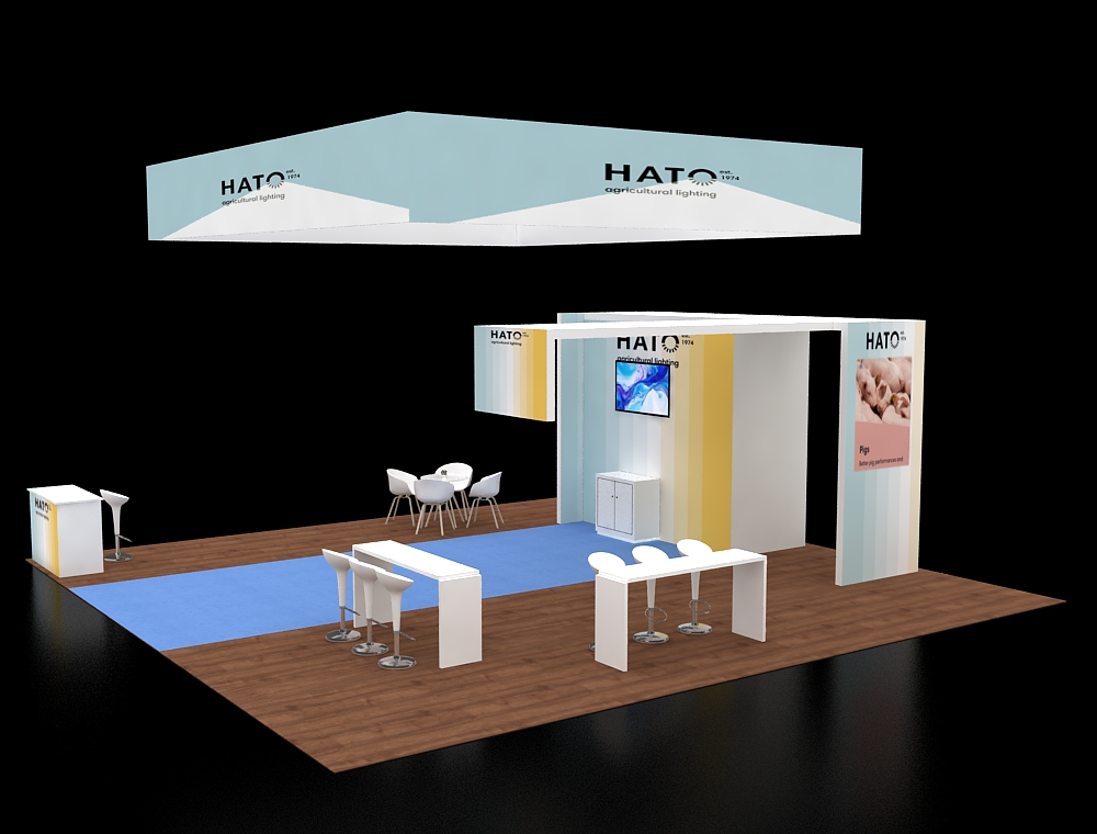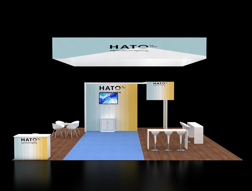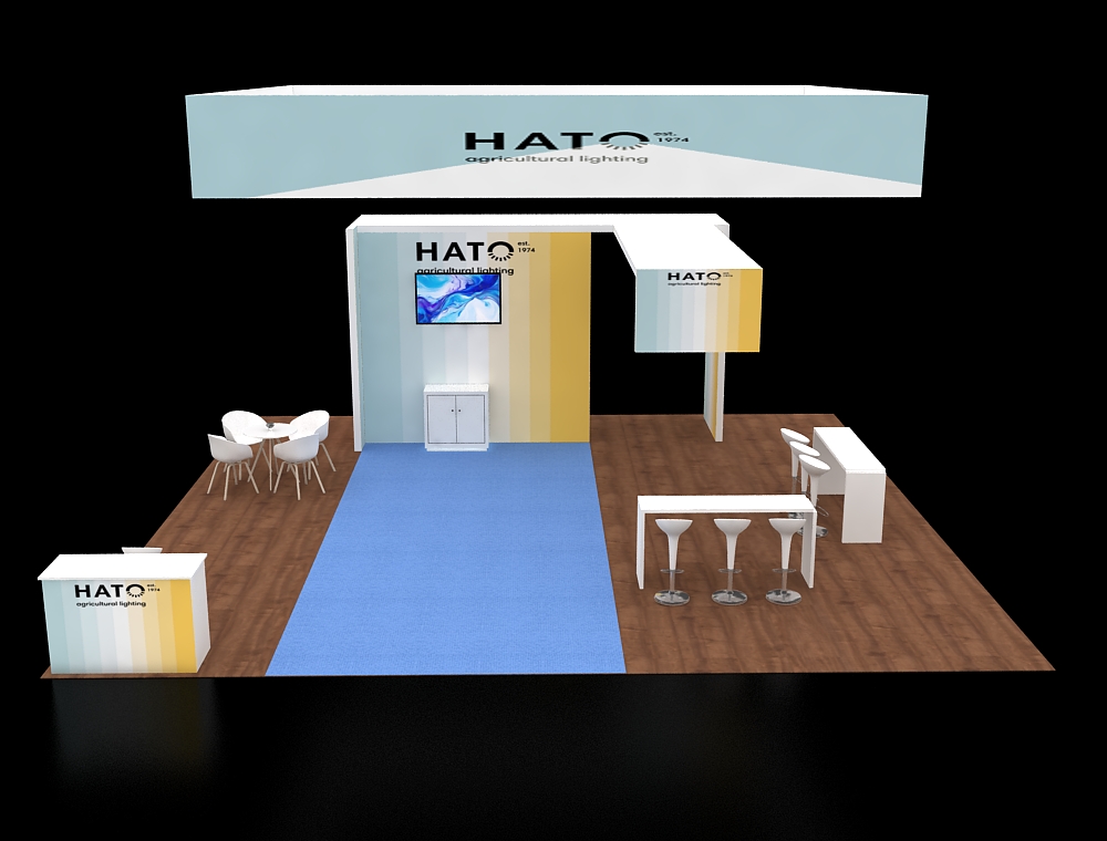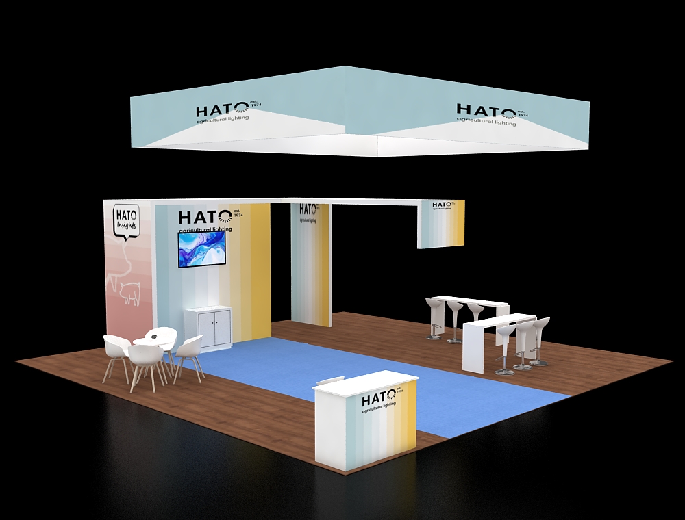 This 30x30 island exhibit utilizes gray carpet flooring and prominent overhead signage. The stand features a central structural tower with an orange accent top and multiple integrated screens. It is encircled by extensive glass display showcases and includes two distinct low seating clusters for detailed customer consultations.