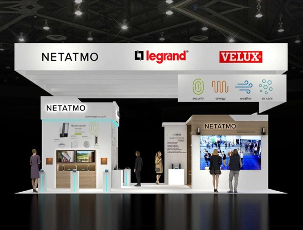 This 30x40 exhibit space features a light wood-grain floor and a prominent orange square canopy suspended above a private white storage room. The architecture includes a long slatted wood pergola extending over a digital media wall and communal seating zones. Multiple engagement areas with white high-top stools, pedestal tables, and integrated display pylons provide a professional environment for various visitor interactions.