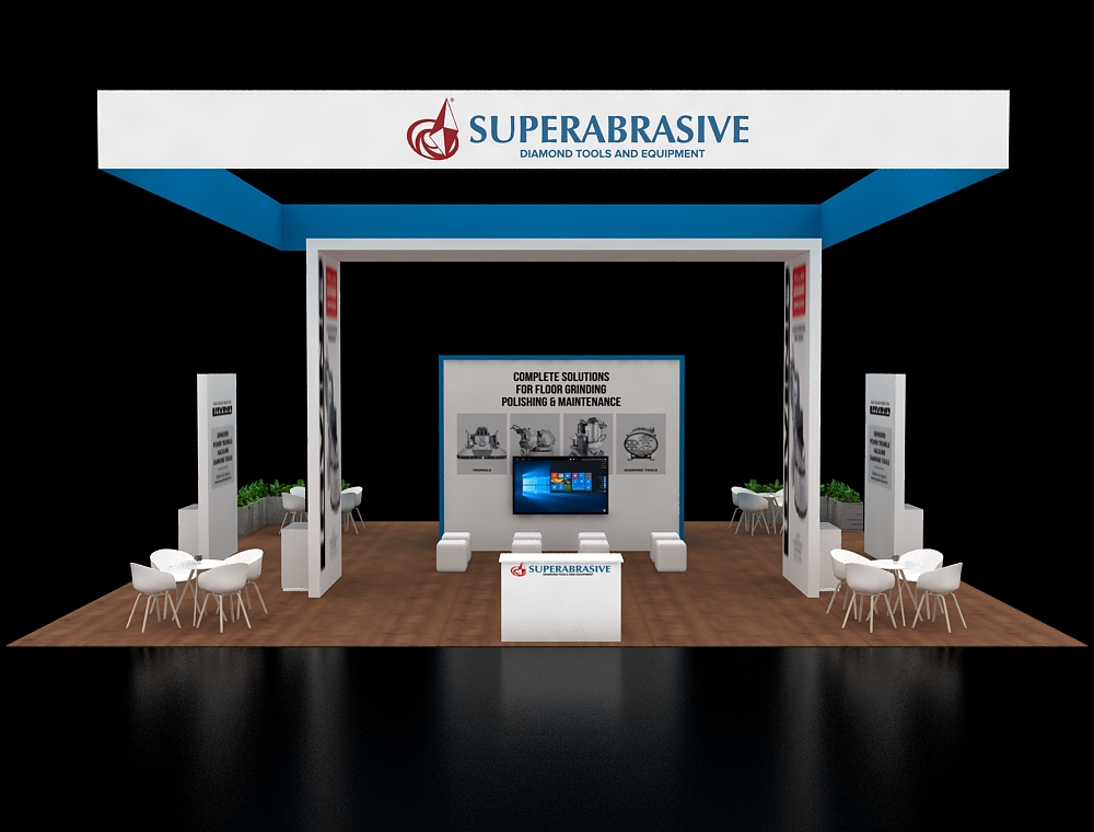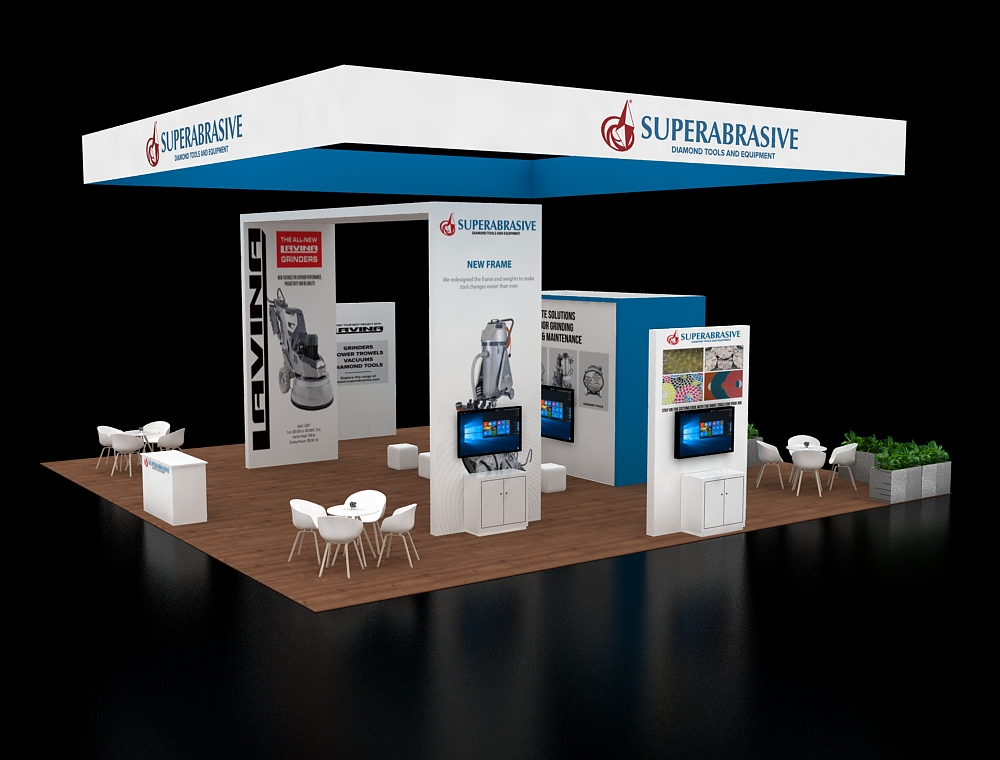 This 40x40 professional layout is defined by a prominent tapered overhead banner and rich wood-textured flooring. The architecture includes a tall L-shaped structural beam on the left and a centralized graphic backdrop. Functionality is maximized through two elongated high-top counters with stools, two circular meeting sets, and a standalone reception desk positioned at the very front.