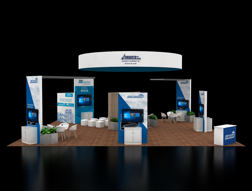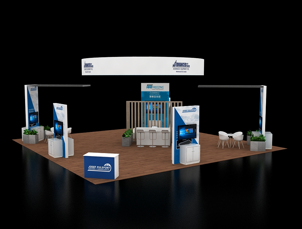 This 40x40 booth is defined by a massive tapered overhead hanging sign and professional wood-style flooring. Along the perimeter, a tall L-shaped structural frame and large back graphic walls provide vertical presence. The interior is organized with two elongated high-top counters with stools, two circular meeting clusters, and a standalone front reception unit for guest engagement.